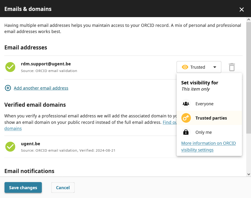 - Next, go to ORCID.org and make sure that your email preferences are set to visible to at least “trusted parties”, so that DMPonline.be has permission to read the primary email address in your ORCID account: