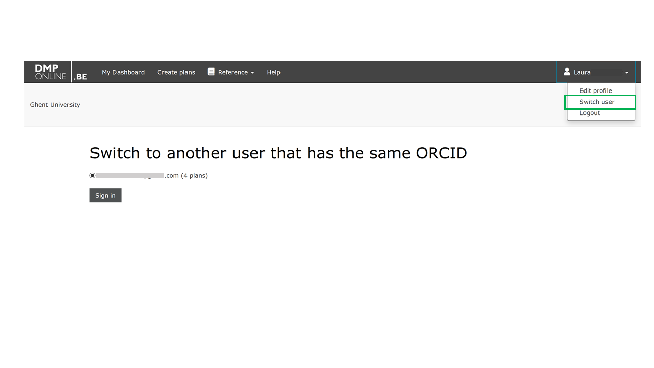 - You have multiple, linked accounts in DMPonline.be. A separate user account is created in DMPonline.be for each email address used. So if you have used more than one email address to sign in (e.g. because you are affiliated with more than one partner institution, you have moved to a new institution, or because your institution has more than one/a new email domain) or if someone has shared a plan with you via a different email address than the one you currently use or have previously used to sign in, you will have multiple accounts in the tool. If your different accounts in DMPonline.be are linked to your ORCID iD, using the ORCID login route allows you to easily switch between those accounts to access the plans associated with each separate account.