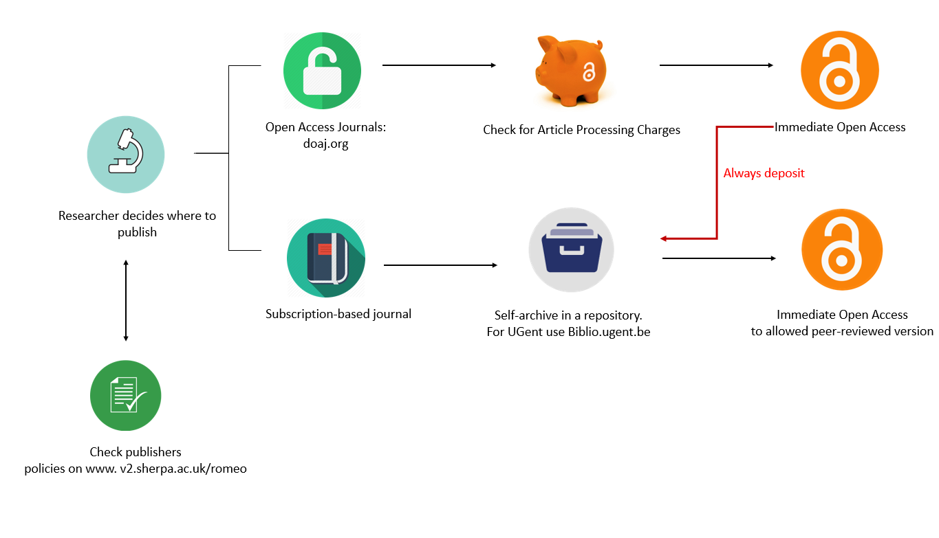 - The author retains the copyright to the published article and can offer the publication themselves in Open Access. Open Policy Finder (formerly Sherpa/Romeo), the database giving an overview of copyright and open access (self-archiving) of publishers, can be accessed to check publisher policies. Researchers at Ghent University can fulfill this mandate by depositing and opening an accepted version of their publications in Biblio. Consult the Biblio FAQ for information about registration of publications.