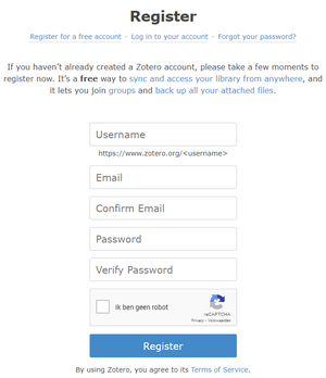 - After you have installed both the Zotero client and the browser extension, you still need to add your account information. On the registration page, fill in all the necessary information to create an account. This is the account to which you will associate all your resources. You can change this information later if you wish (including your email address).
