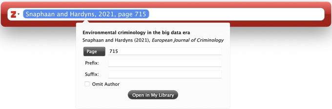 If you want to add a page number to your citation, you can do so by clicking on the citation before pressing Enter. The pop-up menu will give you the option of adding a page number, a prefix or a suffix.